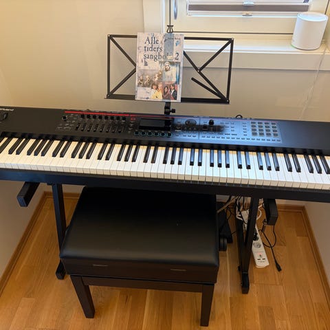 Roland Fantom G8 synthesizer-keyboard med 88 vektede tangenter. Modellen har innebygd lydmodul, stor skjerm for redigering og kontroll, samt ulike knapper, fadrer og pads for styring av lyder og funksjoner. Egner seg til både live-bruk og studioarbeid, med mulighet for lagring og redigering av egne lyder og oppsett.Vurderes solgt til oppgitt pris.