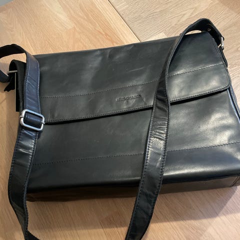 Lite og pent brukt. Uten synlige bruksmerker. Hel og fin, glidelåser er i orden. Flere rom/lommer inni og utenpå (se bilder). Måler ca 32 cm + 33 cm. Lang skulderrem som kan reguleres.