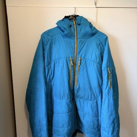 Burton jakke for herre i størrelse M. Jakken er laget i polyester og har et flerfarget, stripete mønster i blå, turkis, grå og brune toner. Den har hette, hel glidelås i front og glidelåslomme på brystet. Innsiden har meshfôr. Egnet som ytterjakke til fritid og utendørs bruk.