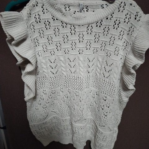 Bik Bok vest for dame i størrelse S. Vest i beige farge med heklet/strukturert hullmønster og volangdetaljer langs ermåpningene. Høy, ribbestrikket hals og ribbekant nederst. Passer til bruk over t-skjorte, skjorte eller genser.