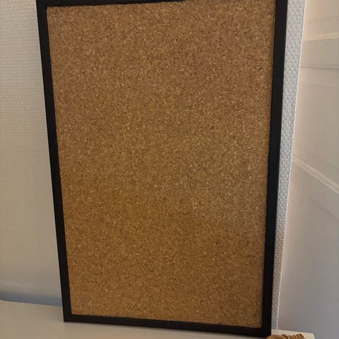 Oppslagstavle i kork med svart ramme. Tavlen har rektangulær form og kan henges både vertikalt og horisontalt ved hjelp av festene på baksiden.