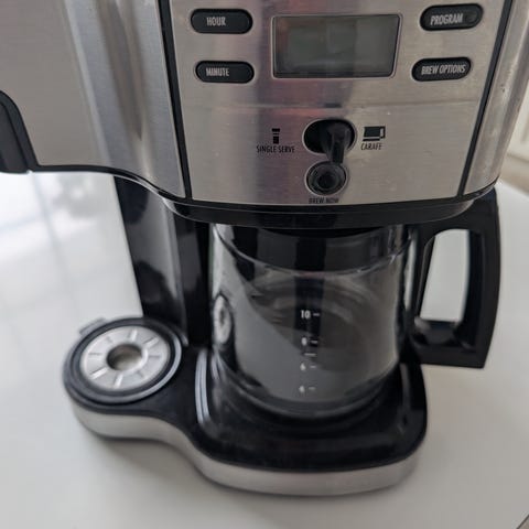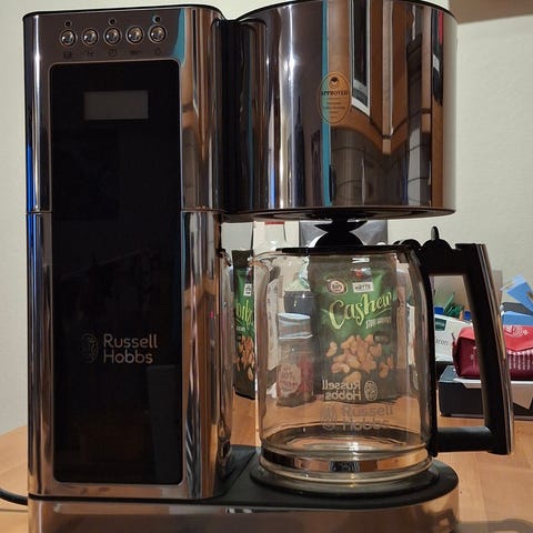 Nesten ny (brukt maks 3 ganger) Russel Hobbs kaffemaskin selges. Den har tidsstyring, så du kan våkne til nykvernet og nybrygget kaffe. Jeg kjøpte denne da jeg fikk gavekort og måtte kjøpe noe. Men jeg bor alene og denne er litt mye for mine behov. Nypris: kr 1200