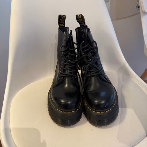 De.Martens boots i skinn. Kun brukt 3-4 ganger. Ingen synlig slitasje, men «bølger i skinnet» (som vist på bilde) som det blir etter første gangs bruk, dette retter seg ut ifra hvem som har på skoen.