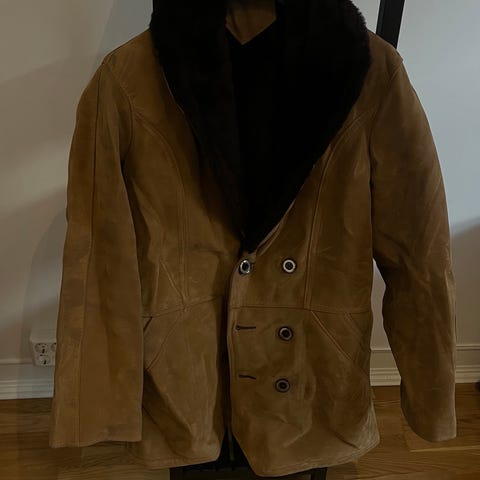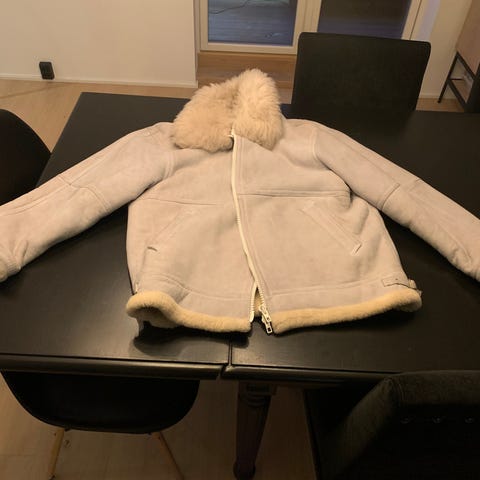 Vintage Skinnjakke fra 1996 i ekte saueskinn med ullfôr. Jakken har utside i brunt skinn og innsiden er fôret med lys, myk ull. Klassisk pilot- eller shearlingstil med kraftig krage og synlige ullkanter langs åpning, nederkant og ermer. Lukkes med glidelås foran og har sidelommer. Justerbare reimer med spenner nederst på sidene. Materialelappen angir ekte saueskinn med ullfôr. Passform og størrelse er for menn M og damer L