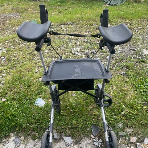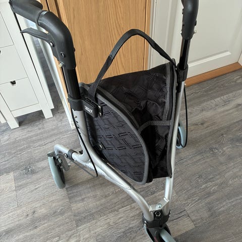 Rullator med fire hjul i svart og grå utførelse. Modellen har håndbremser på begge sider, justerbare håndtak og sammenleggbar ramme. Den er utstyrt med sete og nettingkurv/bag under setet for oppbevaring av mindre gjenstander. Egnet som ganghjelpemiddel både innendørs og utendørs, avhengig av underlag og brukerens behov.