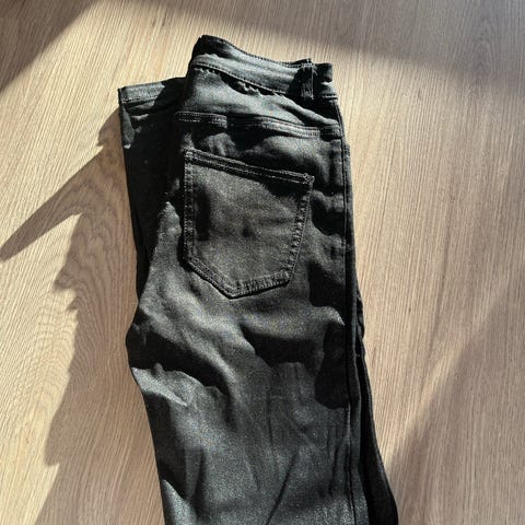 Gina Tricot jeans i svart denim til dame. Buksa er i størrelse 36 og passer en S evt XS'. Klassisk femlommersmodell med knapp og glidelås i front, samt beltehemper i linningen. Stoffet er denim, og fargen har en lett vasket effekt. Passform og lengde fremgår av bildene med mål. Buksen selges ikke i butikk lenger.