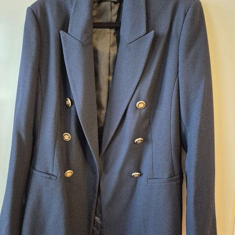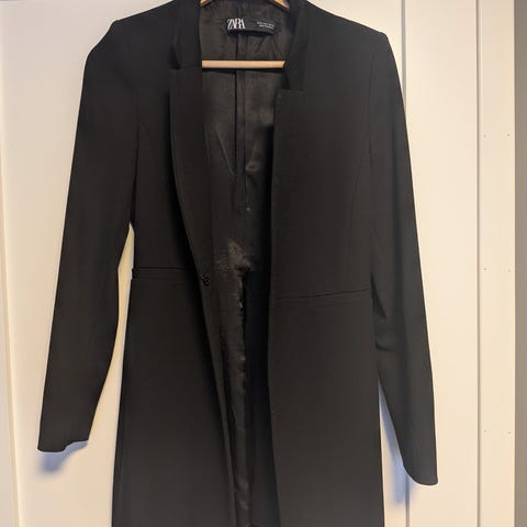 Veldig kledelig og elegant lang svart blazer fra Zara. Kan brukes åpen eller lukkes med en "usynlig" knapp. Tettsittende rundt livet når den er lukket, gir veldig fin fasong. Den er av god kvalitet.
