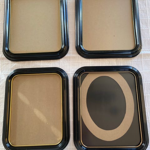 Dette er vintage Jyden-rammer, som er klassiske bilderammer i sort plast med en karakteristisk innvendig gullkant.