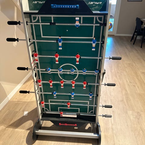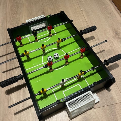 Bordfotballspill med flere spillereader på stenger i røde og blå drakter. Spilleflaten har markert fotballbane med mål i hver ende. Håndtak i plast på stengene gir godt grep. Egnet som bordmodell som kan plasseres på gulv eller bordflate. Passer til innendørs bruk for barn og voksne som ønsker et enkelt fotballspill i miniatyrformat.