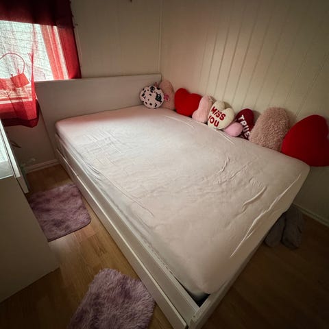 IKEA seng "Brimnes 160x200 med hodegavl selges for 500kr. Den er i god stand, ingen skader, men bruksmerker finnes- se bilder. Vi har også laget 2 hull for ledninger i hodegavl. Madrasser ingår ikke. Sengen er demontert, men ikke sengegavl. Kan hentes i Rygge. Kun vippsbetaling!