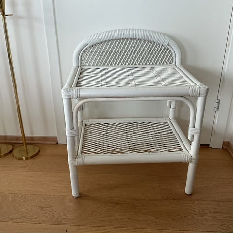 Gammelt solid bord med allsidig bruksområde. Er større enn et nattbord, så passer best i stue eller gang. Praktisk hylle til en blomst eller store bøker. Laget i tre(furu?) og malt med kalkmaling og vokset for maaaange år siden. Kan med fordel gis en ny overflatebehandling