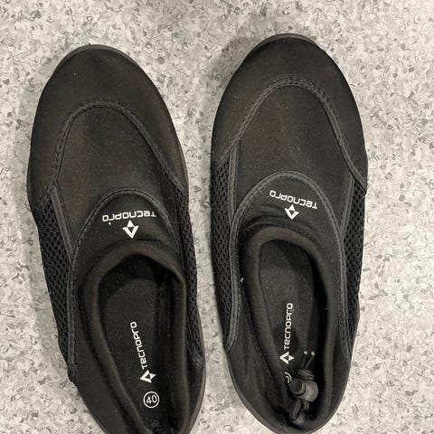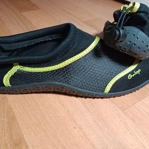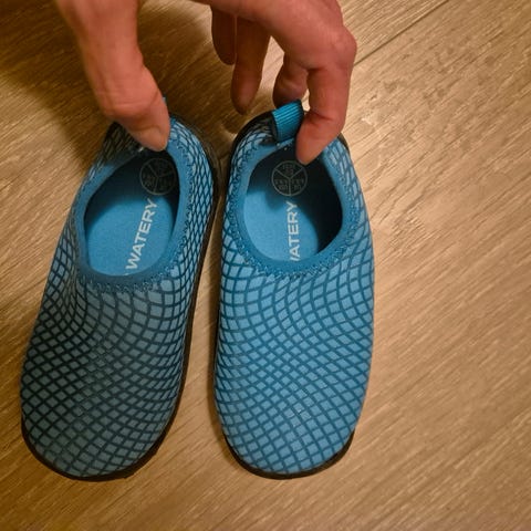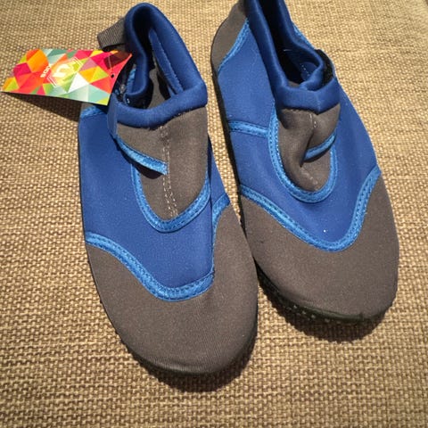 Badesko i blått og svart med nettingstoff på oversiden og fleksibel gummisåle. Skoene har lukket tå og hæl, og er egnet til bruk på stranden, ved bassenget eller andre våte underlag for å beskytte føttene og gi bedre grep. Lite brukt, helt i orden.
