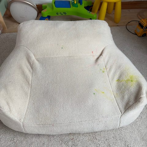 Bamsestol til barn. Polstret stol i barne størrelse med mønstrete trekk. Egnet som sittemøbel på barnerom eller lekerom. Stolen er lett og kan enkelt flyttes rundt etter behov.