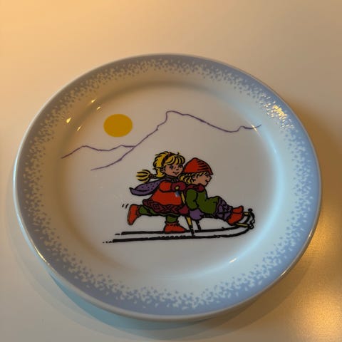 Porsgrund Lillehammer ’94 tallerken i porselen med blå-hvitt motiv av barn på ski. Tallerkenen har offisielt Lillehammer ’94-merke på forsiden og Porsgrund-stempel på baksiden. Egner seg som samleobjekt eller veggdekor. Runde, glatte kanter og blank glasur. Har 3 stk. som kan selges samlet for kr. 400,-