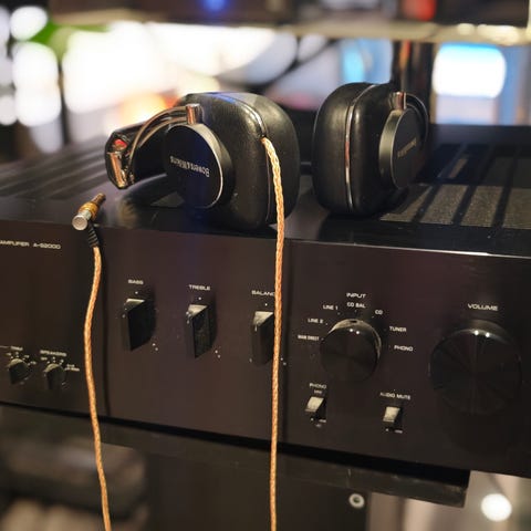 Yamaha stereoforsterker i sølvfarge med trepanel på sidene. Model A-S1000. Fronten har volumkontroll, flere justeringsratt og hodetelefonutgang. På baksiden er det flere høyttalerterminaler og innganger for ulike lydkilder. Enheten leveres med strømkabel og fjernkontroll, egnet for bruk i et hjemmeanlegg for musikk