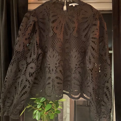 Floyd bluse for dame i størrelse L. Modellen har lange ermer og gjennombrutt blonde- eller heklemønster i stoffet, med underdel i glatt materiale. Passer til bruk sammen med både bukser og skjørt i hverdagen eller til mer pyntede anledninger.