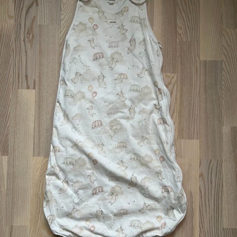 H&M sovepose for barn i størrelse 80. Soveposen er i bomull og har et flerfarget mønster med luftballonger og skyer. Modellen er ermeløs og passer til unisex bruk. Egnet som sovepose over pysjamas i seng eller vogn for små barn som sparker av seg dyna