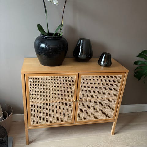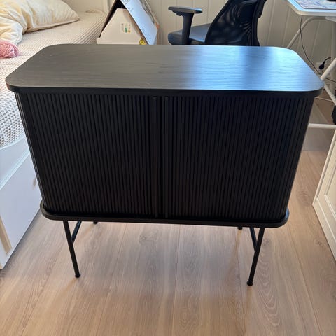 Selger et skap fra H&M Home med sjalusidører i naturfinish og sort topp/understell.
