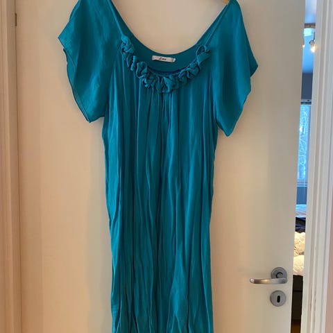 Zizzi sommerkjole for dame i størrelse L. Kjolen er laget i polyester og har et flerfarget mønster med blå bunn og lyse kontrastdetaljer. Kortermet modell med løs passform som rekker omtrent til kneet, avhengig av høyde. Stoffet er lett og faller mykt, egnet til bruk på varme dager eller som en enkel hverdagskjole. Materiale: 100 % polyester (ifølge merkelapp dersom oppgitt). Farge: flerfarget/blåtoner. Størrelse: L.