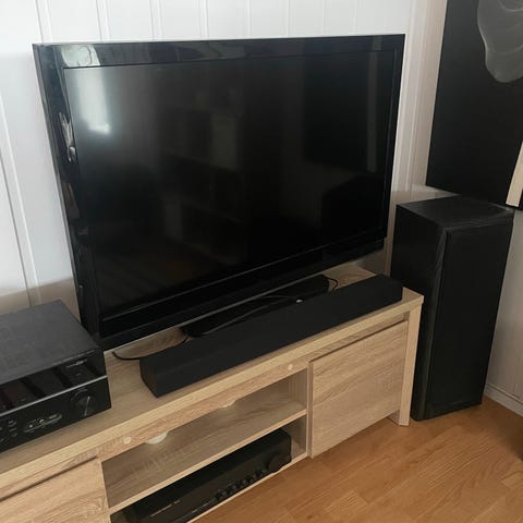 Panasonic TH-42PX74EA plasma-TV med skjermstørrelse på 42 tommer. TV-en har svart ramme og fot, og leveres med fjernkontroll som vist på bildet.