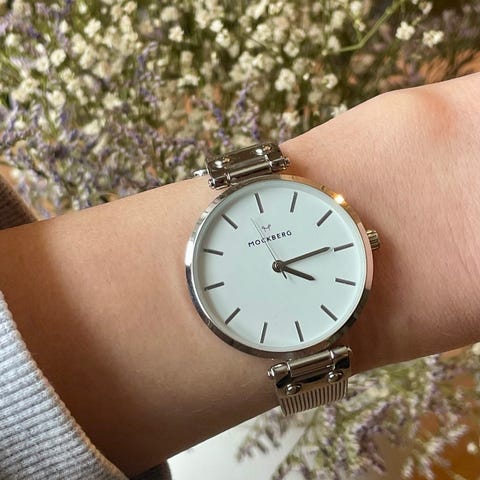 Mockberg dameklokke med rektangulær urskive og gullfarget metalllenke. Klokken har analog visning med time- og minuttvisere. Lenken består av ledd i metall og lukkes med foldespenne. Ekstra ledd følger med for justering av lengden på lenken. Klokken passer til dame og er egnet til daglig bruk eller som tilbehør til penere antrekk.