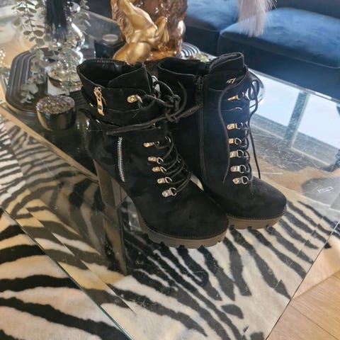 Nelly hæler sko i størrelse 37. Skoene er svarte med platå foran og kraftig hæl dekorert med nagler. Glidelås på siden for enkel av- og påkledning. Passer til bruk ved ulike anledninger der man ønsker et par høyhælte sko med markert hæl.