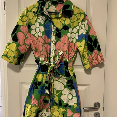 Maggie Wonka sommerkjole i bomull for dame i størrelse XL. Kjolen har flerfarget mønster med grønne og lyse toner.