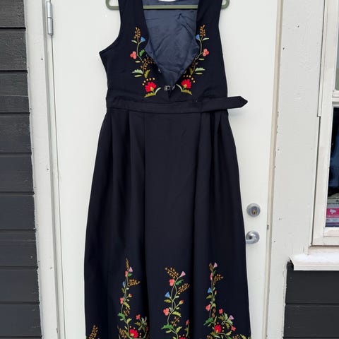 Det er med et varmt, men litt vemodig hjerte at vi velger å selge denne vakre Bergensbunaden. Den ble sydd med kjærlighet til min svigermor. Den har vært med på mange 17. mai-feiringer og store dager, men da vi ikke har døtre som kan føre arven videre, ønsker vi nå at en ny jente eller dame skal få skape sine egne minner i dette praktverket.