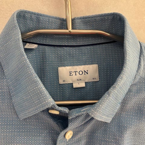 Eton skjorte for herre i størrelse L. Skjorten er blå og laget av bomull. Klassisk krage og knappelukking foran. Passer til bruk i hverdagen eller til mer formelle anledninger, og kan kombineres med både bukse og jeans.