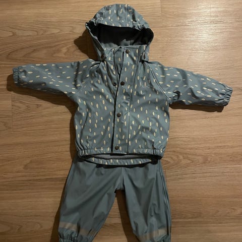 Stor i størrelsen! Er 74/80, men tilsvarer 80/86. Perfekt til våt lek på kalde dager i overgangssesong eller på våte milde vinterdager.