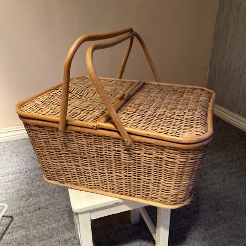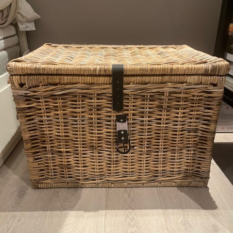 Kurvkiste med lokk i flettet rotting. Rektangulær oppbevaringskasse med hengslet lokk og bærehåndtak på sidene. Naturfarget rotting som passer til oppbevaring av tekstiler, leker eller annet smått i stue, soverom eller gang.