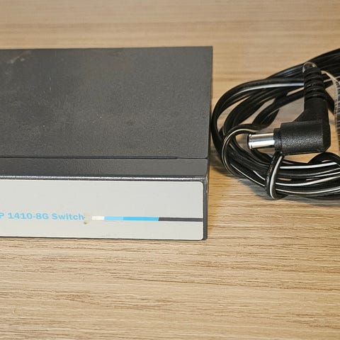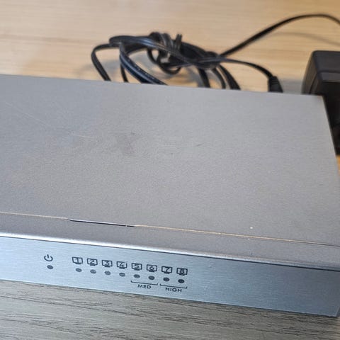 Planet GSD-804 nettverksswitch med 8 Ethernet-porter på baksiden.