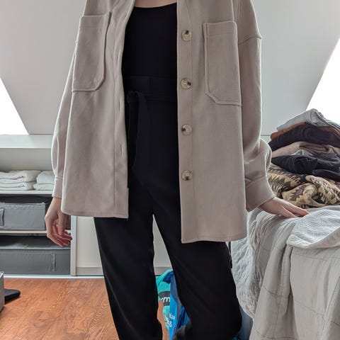 NA-KD jakke for dame i størrelse 38. Jakken er beige og laget i polyester. Modellen har krage, knappelukking foran og to store frontlommer. Rett, noe cropped passform med senkede skuldre og lange ermer. Passer som lett ytterjakke eller overshirt i overgangssesonger.