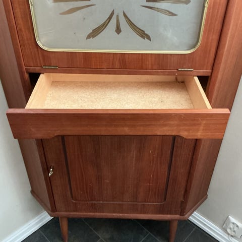 Vil si at skapet er relativt fint etter alder men trenger en shine på lista rundt glasset i barskapdelen.