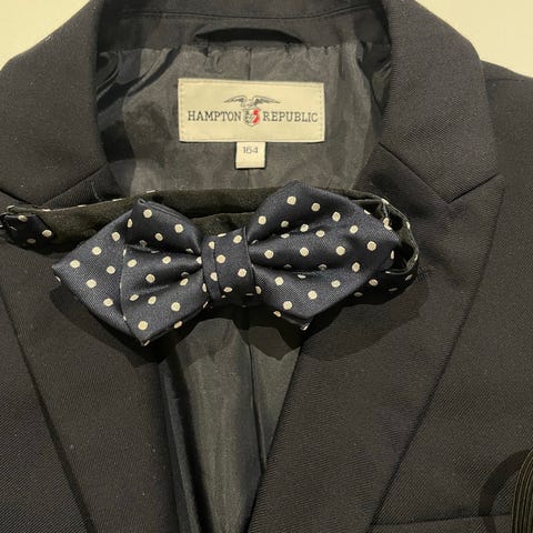 Hampton Republic 27 dressett for gutt i størrelse 164. Sett i blå polyester som består av dressjakke og bukse. Jakken har brystlomme og slag, og buksene har beltehemper og lommer. Stoffet er glatt og lett, egnet til bruk ved konfirmasjon, selskap og andre formelle anledninger.