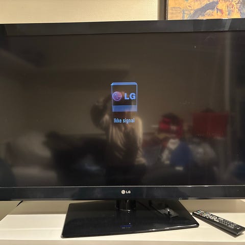 LG flatskjerm-TV i sort utførelse. TV-en har rektangulær skjerm med bred ramme og står på en rund fot.