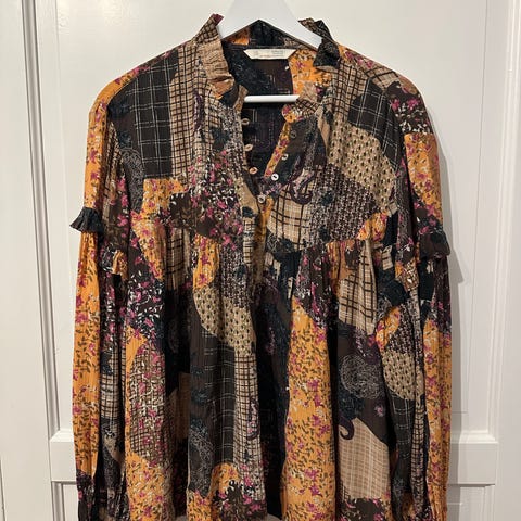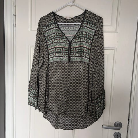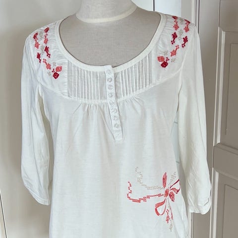 Odd Molly hverdagbluse for dame i størrelse XL. Blusen er hvit og laget i bomull. Den har v-utringning med knyting foran og trekvart lange ermer. Detaljer med brodert motiv på ermet og mønstret kant nederst på blusen. Passer som hverdagbluse.