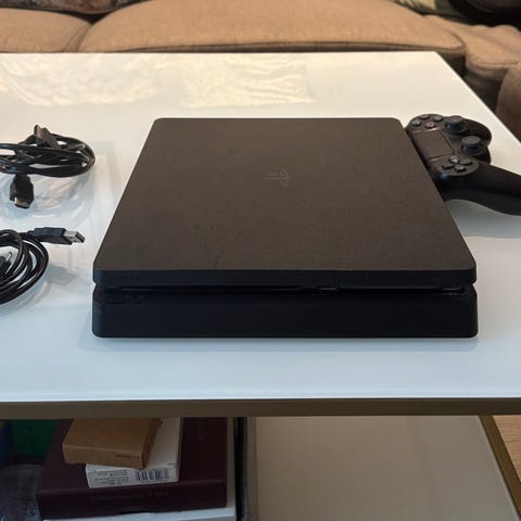 Sony Playstation 4 spillkonsoll i svart farge. Bildene viser en PS4-konsoll med tilhørende strømkabel, to DualShock 4-kontrollere (én svart og én med kamuflasjemønster) samt spillet «The Crew 2» på fysisk disk til PS4. Konsollen er egnet for spilling av Playstation 4-spill, med støtte for tilkobling av flere kontrollere, nettverkstilkobling og bruk av ulike medier i henhold til standard PS4-funksjoner.