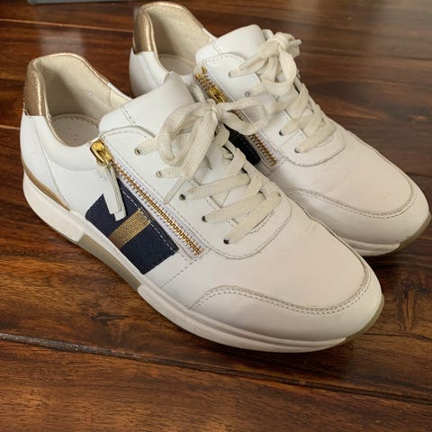 Gabor sneakers i størrelse 41. Modellen er lave joggesko med snøring. Skoene er hvite med lyse detaljer og har flat såle. Egner seg som fritidssko til hverdagsbruk.