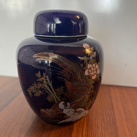Blå keramisk vase med dekor av fugl og blomster på forsiden. Vasen har rektangulær, avlang form med glansfull overflate. Motiv i flere farger, blant annet gull-, hvit- og rosatoner.