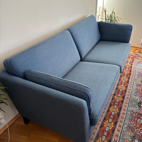 IKEA sofa 2-seter og 3-seter i grått stoff. Sofaen har rette armlener og løse sitte- og ryggputer. Avtagbart trekk.Passer som sittemøbel i stue, TV-stue eller andre oppholdsrom. Gis bort mot henting.
