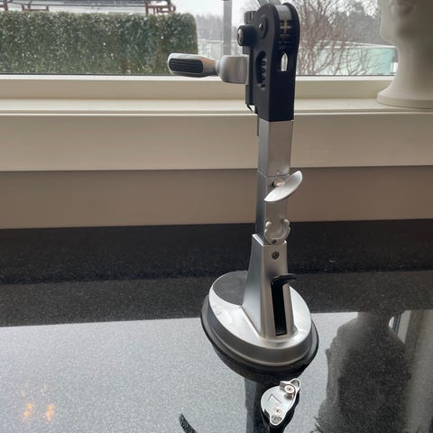Den har flat vakuumsugeplate under og tynn sideklemme i metall for å feste maskinen til kjøkkenbenken eller bordplaten.