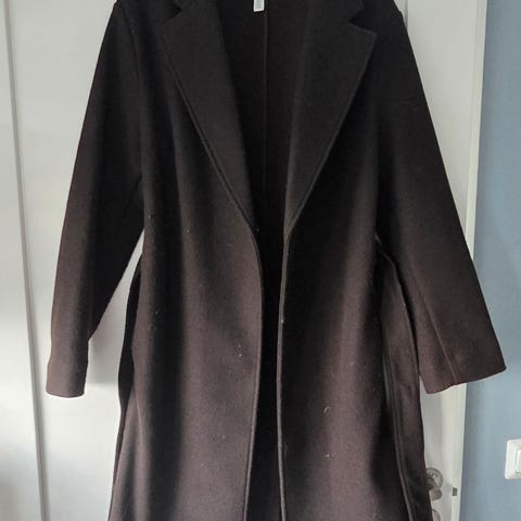 H&M kåpe for dame i størrelse XXL. Kåpen er svart og laget i polyester. Modellen har belte i livet og klassisk krage, og på bildene vises også en avtakbar krage med fuskepels. Passer som ytterjakke i overgangssesonger eller milde vinterdager.
