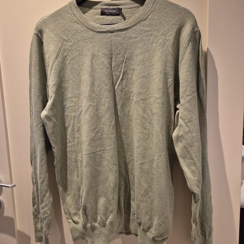 Dressmann genser for herre i størrelse L. Genseren er svart og laget av bomull. Den har rund hals, lange ermer og ribbestrikkede kanter nederst og ved ermene. Egnet til hverdagsbruk eller som en enkel, ensfarget genser som kan brukes alene eller over skjorte eller T-skjorte. Litt ruglete etter vask men er ellers pent brukt og i god stand.