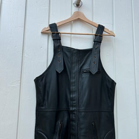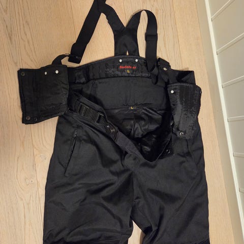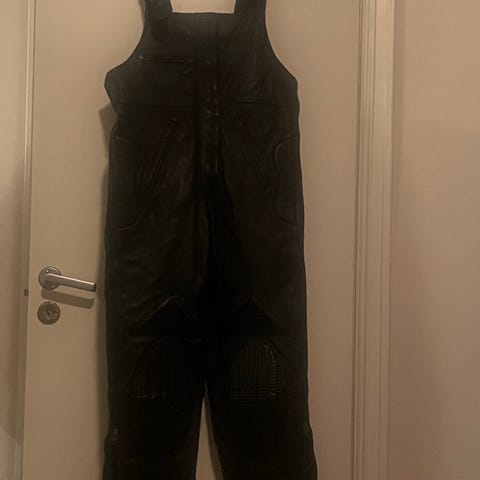 Fin motorsykkel bukse i skinn selges. Brukt kun et par ganger og strøken. Str 58. Passer menn på min høyde 189 cm eller høyere da selene er justerbare. Polstring på knær og hofter.