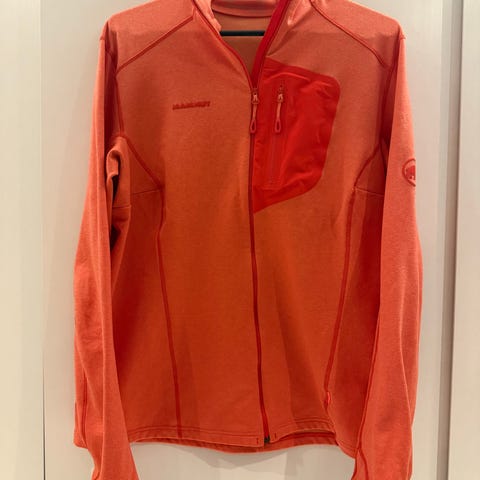 Bergans treningsjakke for dame i størrelse M. Jakken er gul og har hel glidelås i front. Den har høy krage og glidelåslommer i sidene. Egner seg til ulike typer aktivitet og hverdagsbruk der man ønsker et lett lag ytterst eller mellomlag under ytterjakke.