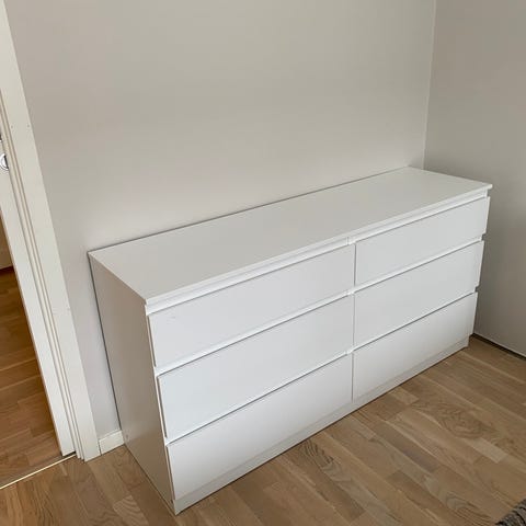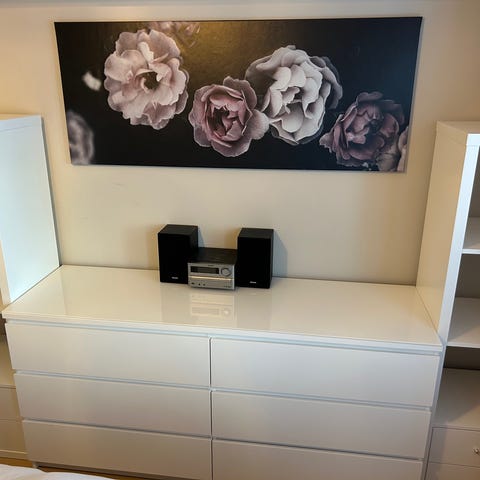 Vitrineskap, kommode og hyller, stellebord med skuff og mumi babynest