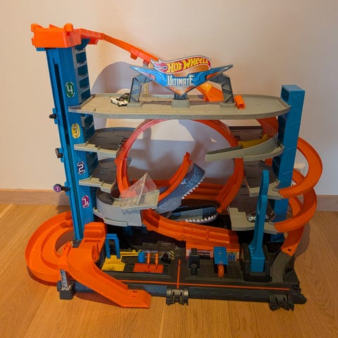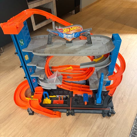 Hot Wheels bilbane og parkeringsgarasje med flere etasjer og integrert loop. Banen har oransje kjørespor, grå plattformer og blå detaljer, med ramper som går gjennom flere nivåer. Egnet for lek med små metallbiler i standard Hot Wheels-størrelse. Passer som innendørs lekesett for barn som liker bilbaner og garasjer.