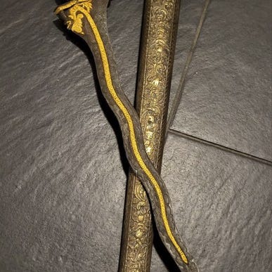 Håndtaket er i tre med omfattende vikling i messing/kobber, og avsluttes med en kraftig endeknott. Overgangen mellom blad og håndtak har en tradisjonell, tett utført innfesting med synlig patina og bruksspor, slik man forventer av eldre håndverk. Total lengde er ca. 41 cm, og vekten er rundt 450 gram. Dette er et flott objekt for deg som samler på etnografika, tribal art, antikviteter eller særpregede interiørdetaljer.
