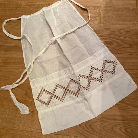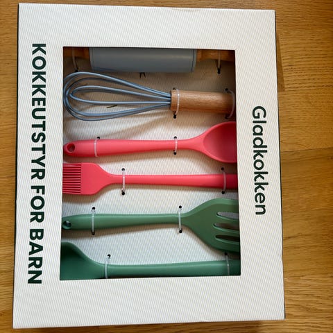 Det er 5 deler: Ett forklé, en kokkelue, to grytekluter og en praktisk pose til å samle alt oppi. Kjøpt hos Europris for kanskje 10 år siden. Det er på tide nå å sende de videre til noen små som gjerne vil være med å kokkelere.